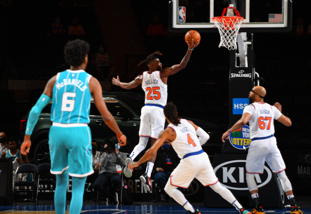And that team was able to lay a Defense against Charlotte and their 3’s that held the Hornets scoreless for over 4 and a half minutes — from 6:45 left (and Charlotte up by 4) to 2:09 left (with NY up by 4). In between, Julius Randle stepped up with a 3 and a 2-pt bucket to bring the Knicks back into the lead.
