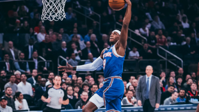 RJ Barrett also dominated in this game, scoring at will early and then coming up with a crucial play late. After shooting an air ball 3-pt attempt with 46 seconds left and the Knicks up 122-121, Barrett called for an iso play on the next possession, against tough defender P.J. Tucker with 10 seconds left. Barrett drove left against contact for the lefthanded drive to put the Knicks up 124-121.