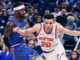 Mitchell Robinson (5-6 shooting, 12 pts, 9 rebounds, 3 blocks) shone out early, blocking or altering several James Harden drives to the basket, or causing him to effect his play. On one possession, Robinson blocked Harden’s layup sending it out of bounds, then Houston inbounded, and Harden through a pass through the lane out of bounds. But soon Houston started to build a big lead.