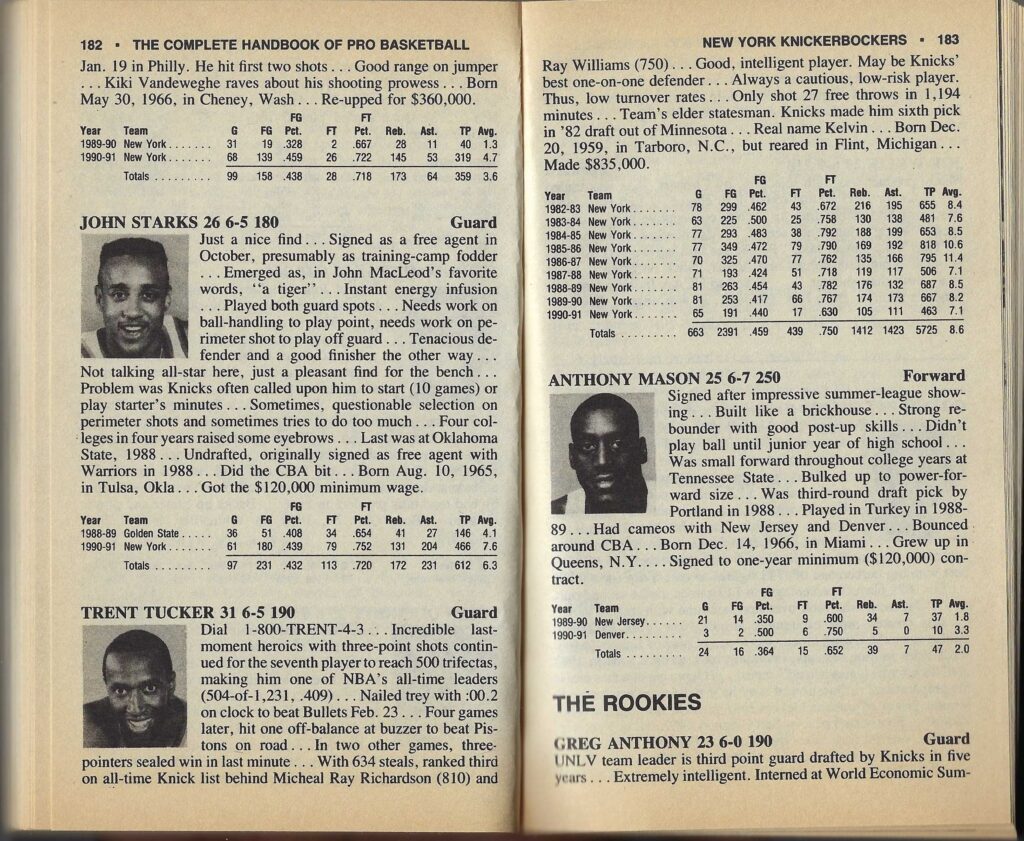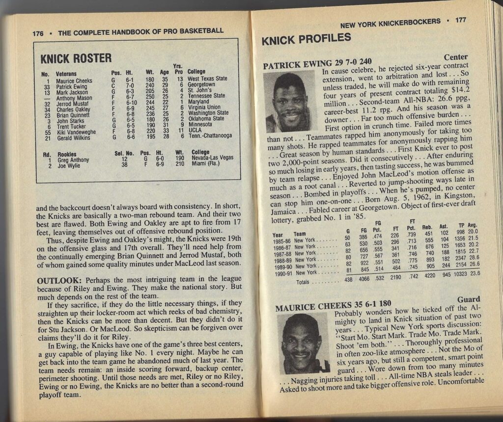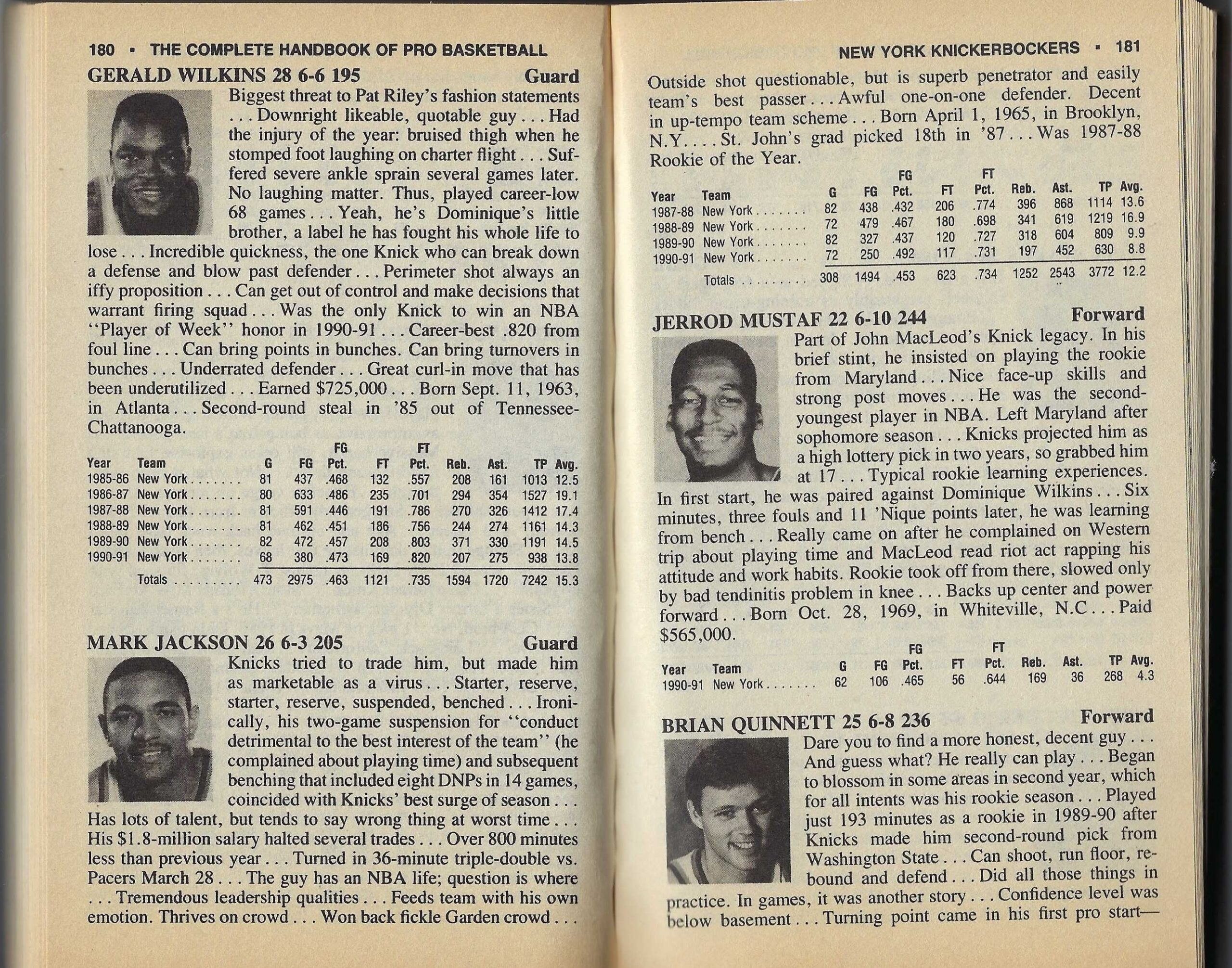 I’m posting a sampling of the 1991-92 Handbook — the pages for the Knicks team — under Fair Use doctrine of Copyright law, and with perfect hindsight, will analyze Zander’s analysis.