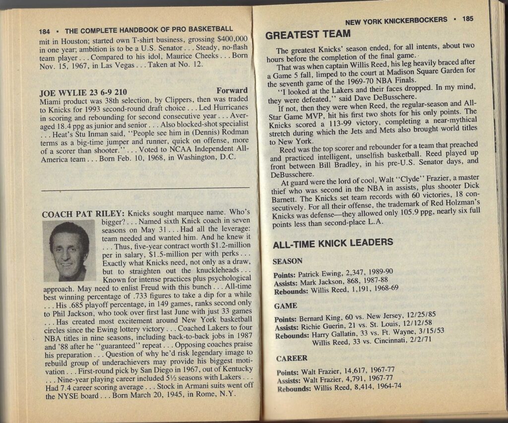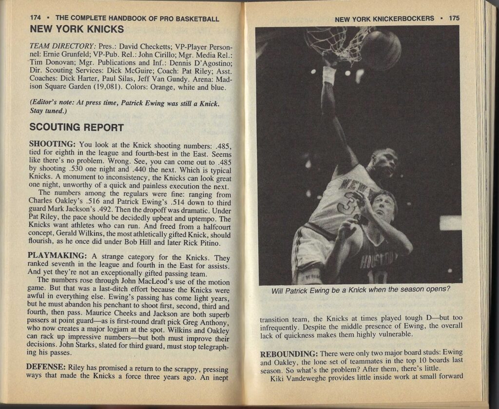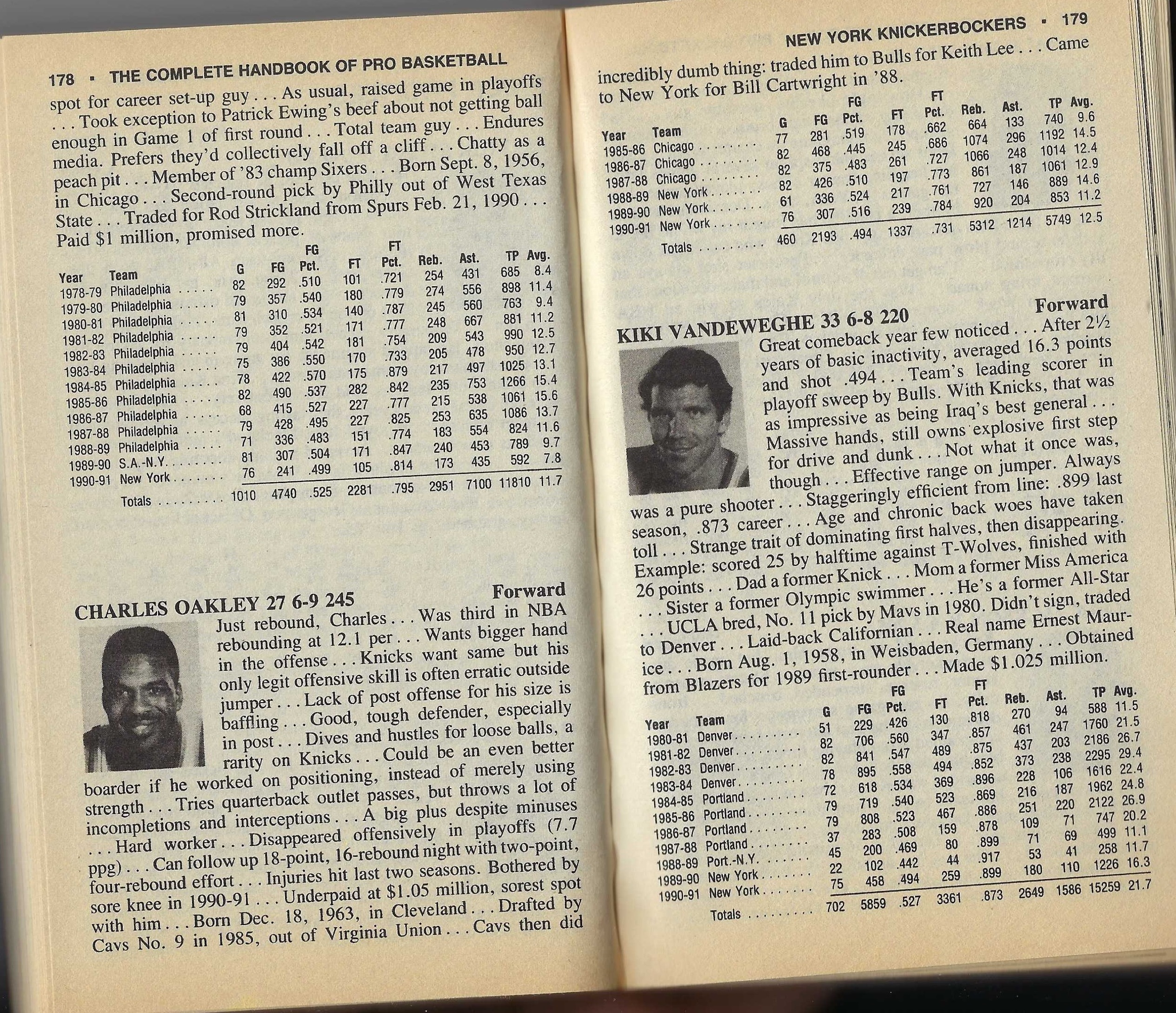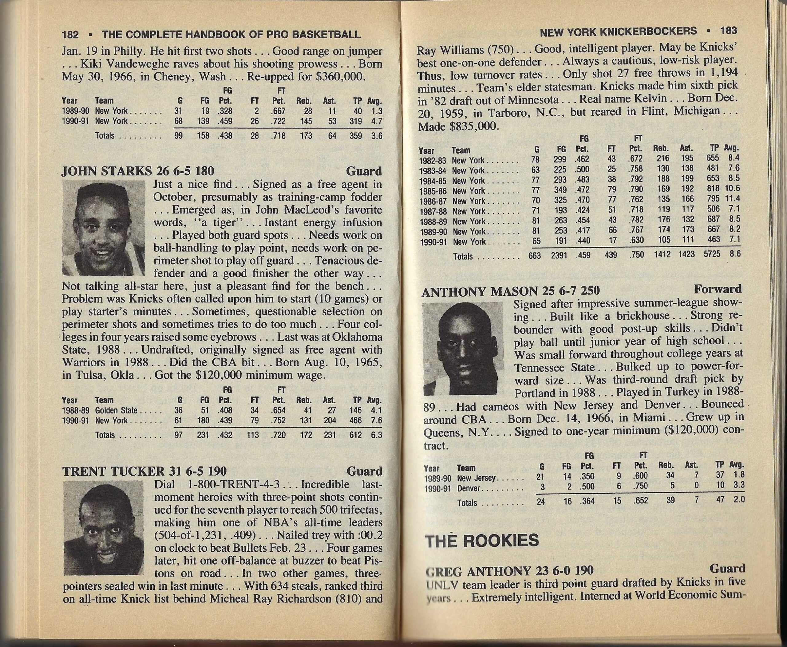 I’m posting a sampling of the 1991-92 Handbook — the pages for the Knicks team — under Fair Use doctrine of Copyright law, and with perfect hindsight, will analyze Zander’s analysis.