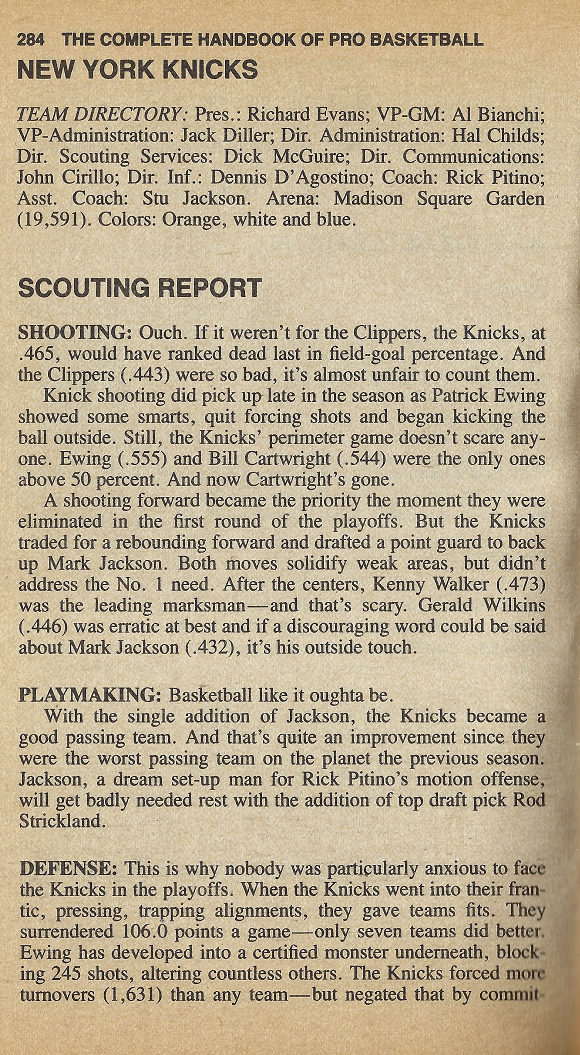I’m providing a sampling of the 1988-89 Handbook — the pages for the Knicks team — under Fair Use doctrine of Copyright law, and with perfect hindsight, will analyze Zander’s analysis. The 1988-89 Knicks were the Knicks of Rick Pitino — about to be dubbed The Bomb Squad.