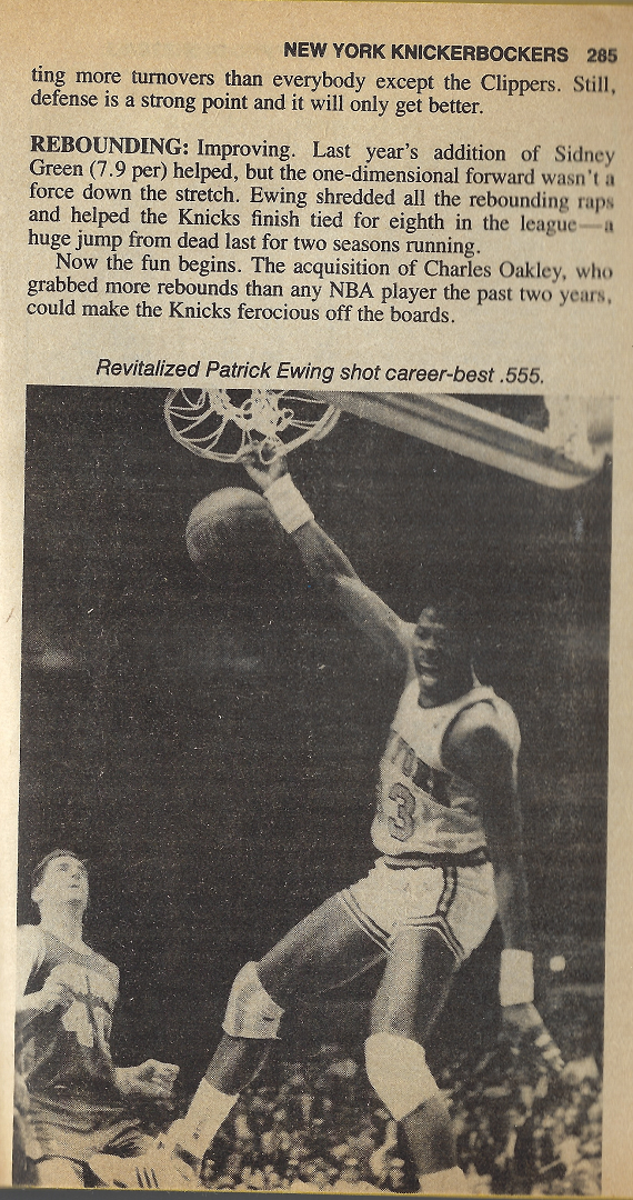 The Knicks had a front line of: Patrick Ewing, Charles Oakley (whom they had just acquired), Kenny Walker, and Sidney Green.
