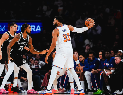 The Knicks dominated from the opening bell — with Karl-Anthony Towns scoring at will inside against Nic Claxton, Mitchell Robinson dominating on the offensive and defensive glass and scoring on slams, and the Knicks passing crisply and hitting 3’s.