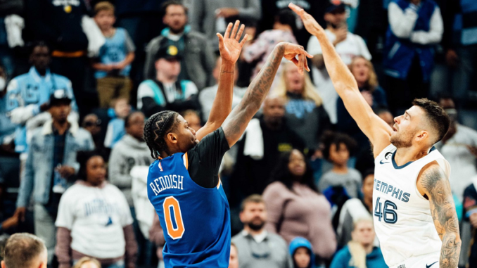 The Knicks came out to start the season with not enough energy to match that of the Memphis Grizzlies, who immediately jumped out to a 13-7 lead. Mitchell Robinson started banging inside — grabbing an offensive rebound here, and blocking a John Konchar layup there to start the Knicks rolling. By the time Robinson was spelled by Isaiah Hartenstein with 4 minutes left in the quarter, NY had a 16-15 lead.