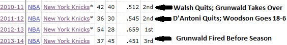 - Can Grunwald get all the credit for the 2012-13 season? He gets most of it — Walsh had brought in Carmelo Anthony (but gutted the previous roster including Zach Randolph for nothing in return to do so) but it was Grunwald who made the major changes that resulted in the 54-win campaign — bringing in coach Woodson who stressed Defense, Jason Kidd to orchestrate, Rasheed Wallace to lead at the beginning of 2012-13, JR Smith and other key players (Kenyon Martin, etc).