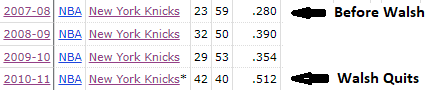 - The first two years with Walsh as GM were miserable (32-50 and 29-53) as Walsh gutted the roster to dump all salaries for the big free agent spend. The Knicks had a short-term resurgence under D’Antoni with Stoudemire and Felton and Gallinari at the start of the 2010-2011 season — but the Melo trade threw the team off kilter, and that team ended up 42-40, making the playoffs but being swept 4-0 by the Boston Celtics in the 1st round.