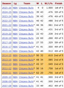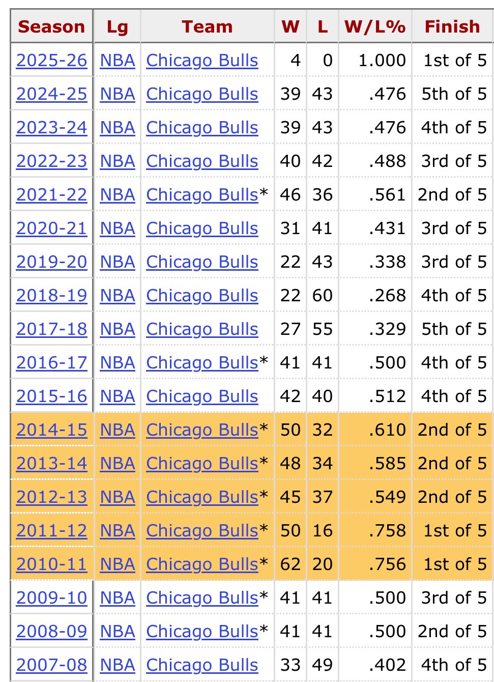 After firing Thibs, the Bulls spent 5 years in disarray, plummeting to one of the worst teams in the NBA — before gradually becoming a .500 team for 5 years under Billy Donovan, and finally looking like a playoff team this year.