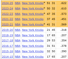Meanwhile Thibs went to Minnesota where he turned a 29-win team into a 47-win team before getting fired again after 3 years for reportedly the same reasons (bull headedness). He then was hired by Leon Rose and coached the Knicks to their best, sustained-winning basketball in 25 years. Thibs record with NY is highlighted in yellow below.