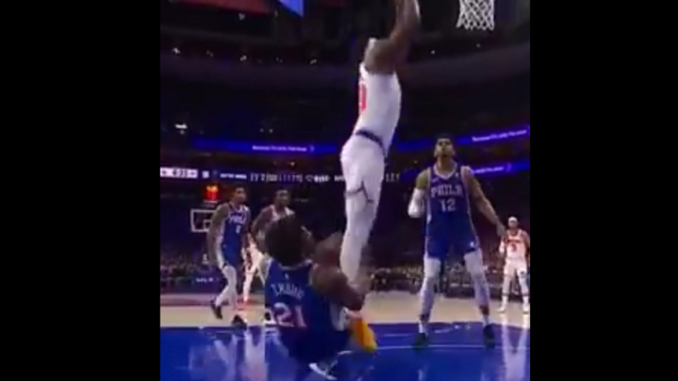 With 4:34 left in the quarter, OG Anunoby got the ball inside and attempted a short jumper but Embiid knocked the ball loose momentarily from OG’s hands, then flopped backwards to try and draw an offensive foul. Anunoby grabbed the ball back and fed Mitchell Robinson underneath for an easy slam — but Joel Embiid, on the floor, grabbed Robinson’s legs and pulled him down. It was a career-threatening play — Embiid was charged with a Flagrant 1. Many felt it was clearly a Flagrant 2 and he should have been ejected.