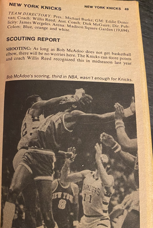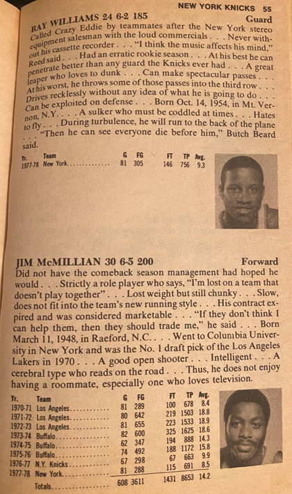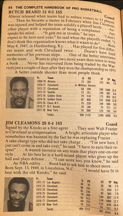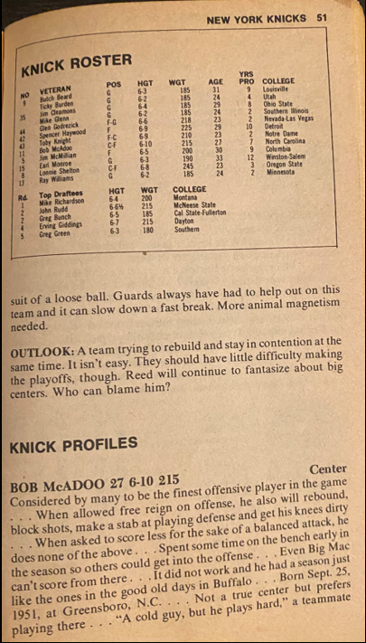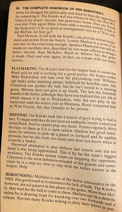 I’m providing here a sampling of the 1979 Handbook — the pages for the Knicks team — under Fair Use doctrine of Copyright law, and with perfect hindsight, will analyze Zander’s analysis. The book details the 1977-78 season, with the 1978-79 season about to begin. The Knicks had just finished 43-39, and won the first round series over Cleveland, but got swept by Philadelphia in round 2, as they double teamed Bob McAdoo.