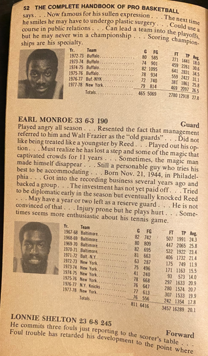 Earl Monroe was indeed not that spectacular at this point in his career — his press clippings at the time belied what you saw on the court — which was a kind of slow unathletic guard who could still score on jumpers after some gyration shake-and-bake moves. But there was no D and no passing. Monroe would average a career low 12.3 ppg in only 64 games in 1978-79, and then 7.4 ppg in only 51 games in 1979-80 before retiring a Knick. He remained a fan favorite as much as ever — as offense off the bench.