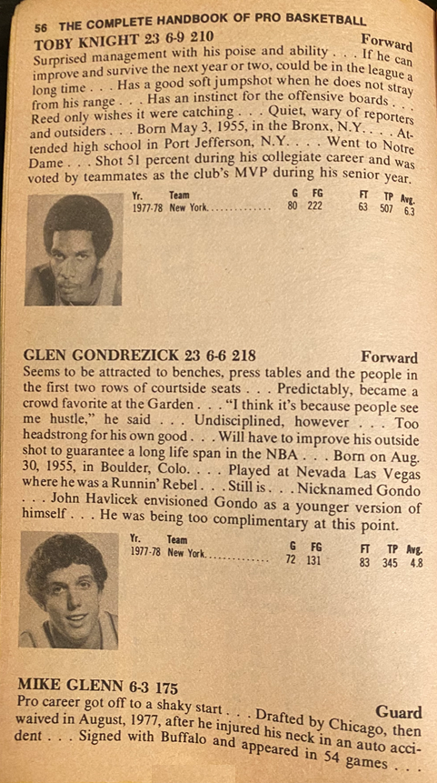 A lot of talented youth on this team — again making it look like a great team on paper. The young Toby Knight would make his mark in 1978-79, averaging 16.6 ppg, and taking over at the forward scoring slot after McAdoo and Haywood were jettisoned. Glenn Gondrezick — Gondo — was a fiery player as Hollander points out. He’d play 1978-79 with NY, averaging 5.0 ppg before NY waived him. Gondo got picked up by Denver, where he played 4 years, averaging 4.6 to 8.3 ppg, before retiring.