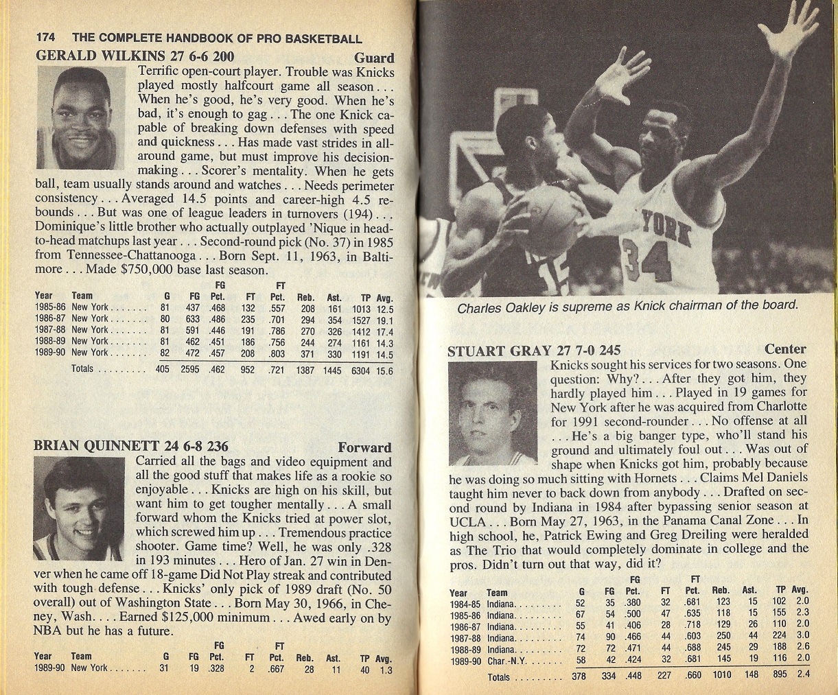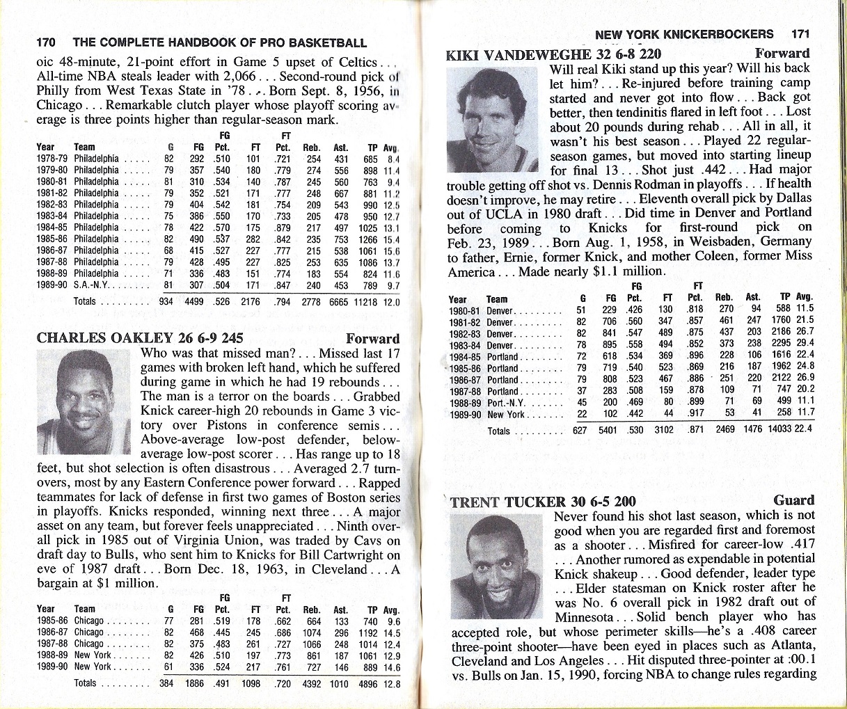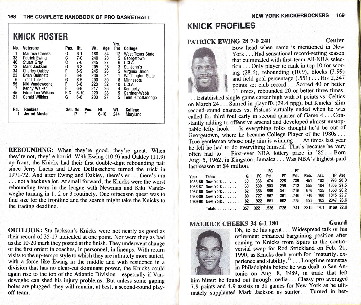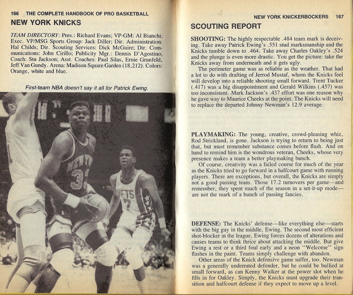 I’m providing here a sampling of the 1991 Handbook — the pages for the Knicks team — under Fair Use doctrine of Copyright law, and with perfect hindsight, will analyze Zander’s analysis. The book details the 1989-90 season, with the 1990-91 season about to begin.
