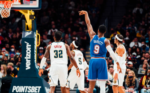 Much was made of the fact that coach Tom Thibodeau had RJ Barrett still in the game in the final minute while Denver had an 18 point lead — and Barrett injured his ankle, limping off the court. Barrett did score the Knicks last two buckets of the game in that final minute to finish with 18 points — and he is averaging 18.0 ppg on the season.