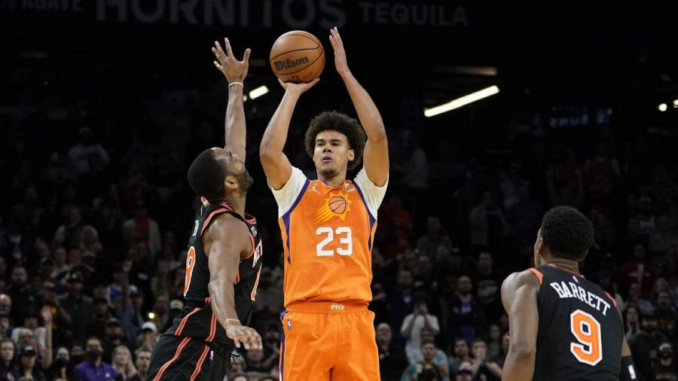 The Knicks held a 2-pt lead with 7 seconds left and Alec Burks on the free-throw line for one more free throw. But he missed it, the ball bounded around off 4 people, was picked up by Mikal Bridges, who rushed it up court, and in a frenetic finish, dished it to Cameron Johnson who threw up a 35-footer from top of the key, and banked it off the glass at the buzzer for a 3-pointer and Phoenix win.