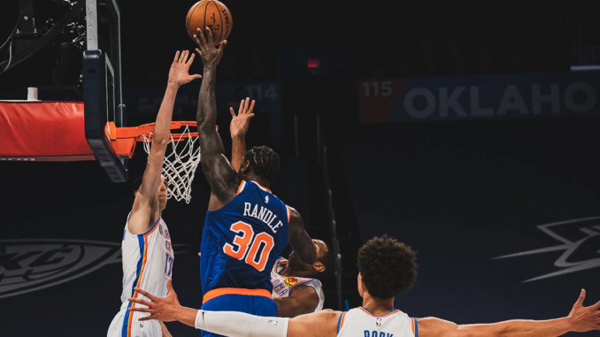 This was supposed to be an easy win for the Knicks — facing 16-21 Oklahoma in Oklahoma City who were without their star Shai Gilgeous-Alexander. But the Knicks came out listless as Frank Ntilikina again did not assert himself. He at one point tried to drive the lane, stumbled and pushed the ball to Randle while on the floor. Without a true point guard on the court, penetrating and distributing, Randle started to ‘try too hard’, which saw him do some of the things he did last year — go one-on-everyone underneath and put up a contested shot. In 5 minutes — literally 5 minutes and 21 seconds into the game — coach Tom Thibodeau pulled Ntilikina from the game, after he picked up a 2nd foul call — not a smart thing to get in foul trouble on a night where the Knicks were missing 3 point guards. NY was down 15-7. Immanuel Quickley came in and immediately the tenor changed for the Knicks as Quickley went into attack mode and also the Knicks team Defense woke up.