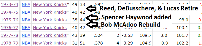 - On paper one of the best Knick teams ever, the 1977-78 Knicks won 43 games — Haywood was injured and missed most of the season. The Knicks blew past Cleveland in the 1st round. Then Philly double-teamed McAdoo and swept the Knicks in 4 in the 2nd round.