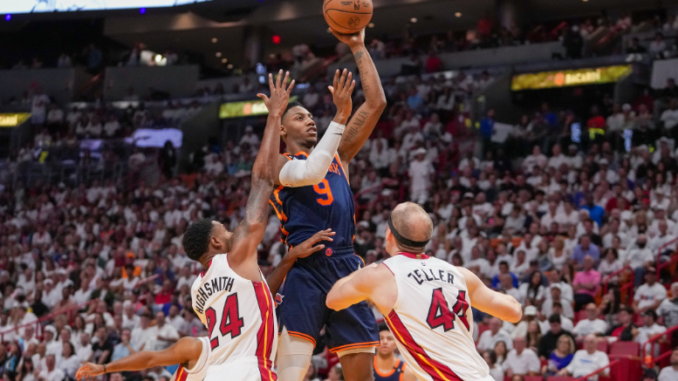 The Knicks started to gain their confidence and footing and started to eat into the Miami lead — Jalen Brunson started penetrating and hitting floaters, Immanuel Quickley started getting buckets, and Josh Hart and Quentin Grimes added to the offense.