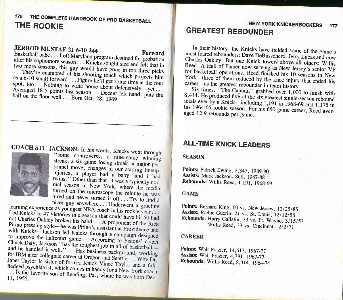 I’m providing here a sampling of the 1991 Handbook — the pages for the Knicks team — under Fair Use doctrine of Copyright law, and with perfect hindsight, will analyze Zander’s analysis. The book details the 1989-90 season, with the 1990-91 season about to begin.